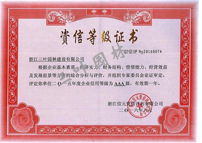 近日,浙江三葉園林建設(shè)有限公司被授予“2016年AAA信用等級(jí)企業(yè)”榮譽(yù)稱(chēng)號(hào)。從2003年首次獲得該榮譽(yù)至今,三葉園林已連續(xù)十三年獲評(píng)“AAA信用等級(jí)企業(yè)”,是連續(xù)獲得此項(xiàng)榮譽(yù)時(shí)間較長(zhǎng)的企業(yè)。