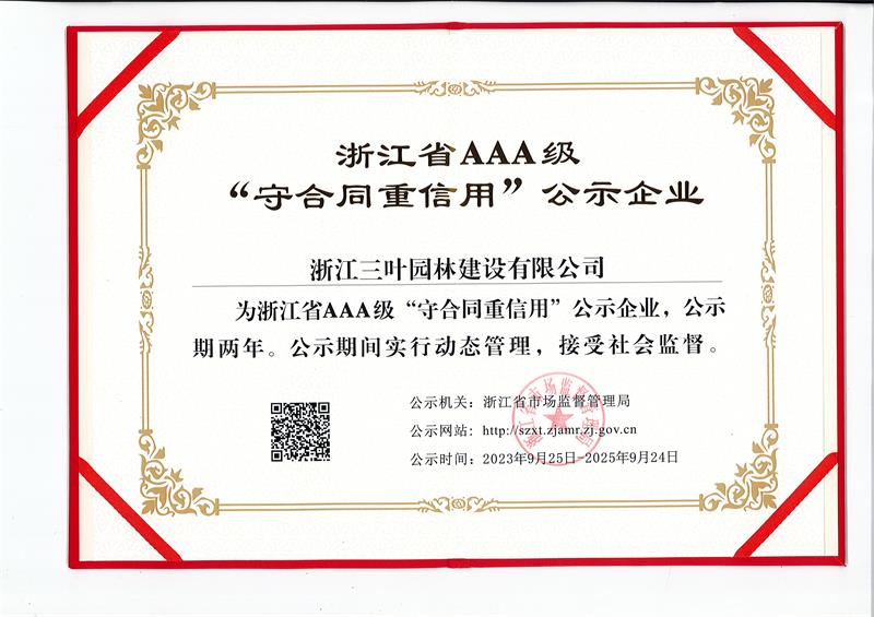 - 三葉園林成功延續(xù) 浙江省AAA級(jí)"守合同重信用"企業(yè)