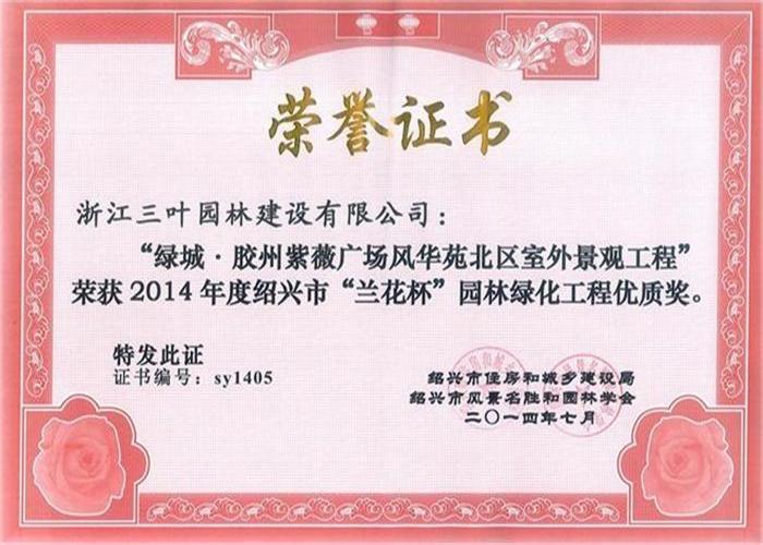 近日,根據(jù)紹興市住房和城鄉(xiāng)建設(shè)局、紹興市風(fēng)景名勝和園林學(xué)會專家評審委員會的資料審核、現(xiàn)場考評、終審評定、浙江三葉園林建設(shè)有限公司綠城膠州紫薇廣場風(fēng)華苑室外景觀工程,喜獲2014年度紹興市“蘭花杯園林綠化工程優(yōu)質(zhì)獎。