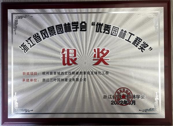 2023年12月14日,第十二屆“園林人居”論壇暨2023年度浙江省風(fēng)景園林學(xué)會優(yōu)秀園林工程獎頒獎大會在杭州圓滿召開。會上宣讀表彰了“2023年浙江省優(yōu)秀園林工程獎獲獎項目的通知”,全省共有306個項目分別獲規(guī)劃設(shè)計獎、施工類(金、銀、銅)、養(yǎng)護類獎項,其中三葉園林承建的杭州翡翠城西北四期硬質(zhì)景觀及綠化工程獲得省“優(yōu)秀園林工程”銀獎。