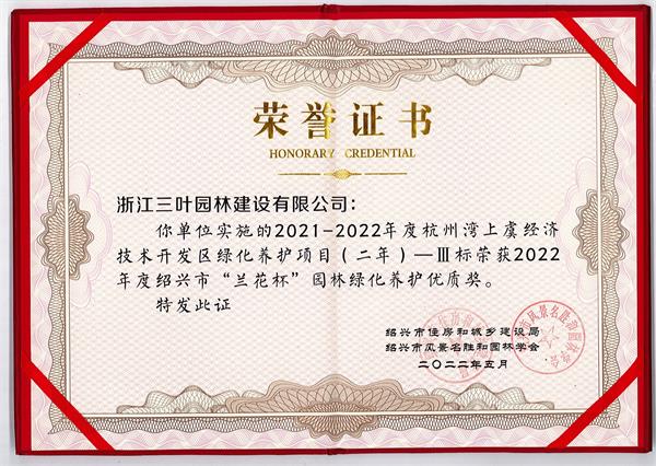 • 2021-2022年度杭州灣上虞經(jīng)濟技術(shù)開發(fā)區(qū)綠化養(yǎng)護項目(二年)—Ⅲ標(biāo)喜獲紹興市蘭花杯